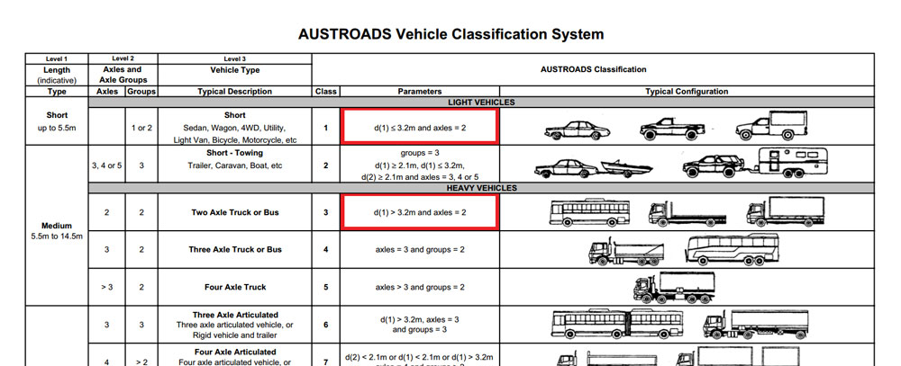 The results of further investigation provided an interesting outcome. The unexpected classification was not due to an error in tube spacing and length or by a faulty counter. Its explanation lies in SV Class definition, according to the Austroads scheme. With a wheelbase longer than 3.2m, this vehicle doesn’t slot into Class 1 and is pushed into the TB2 group.